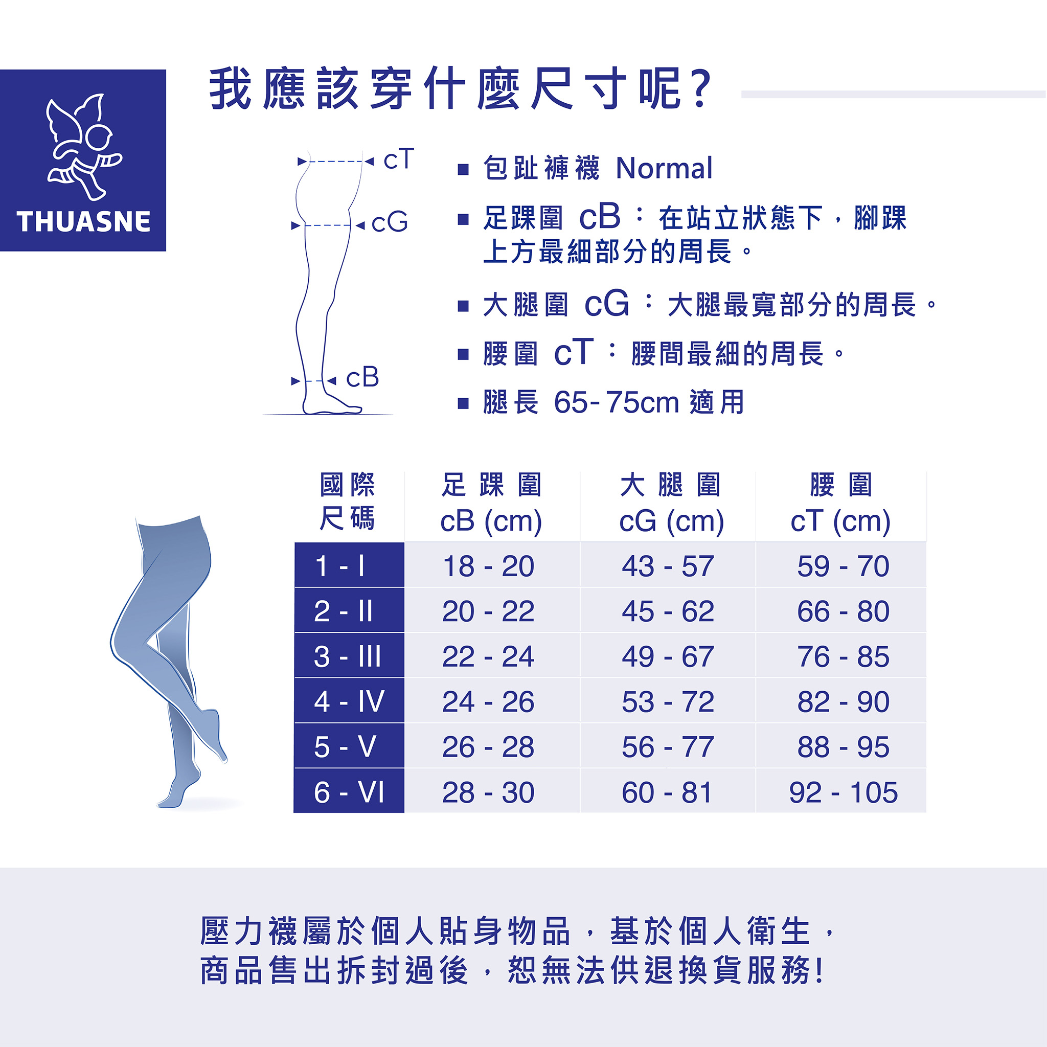 ※ 註:壓力襪屬於個人貼身物品,基於個人衛生,商品售出拆封過後,恕無法供退換貨服務!購買前請仔細確認尺寸再下單,謝謝您的配合!