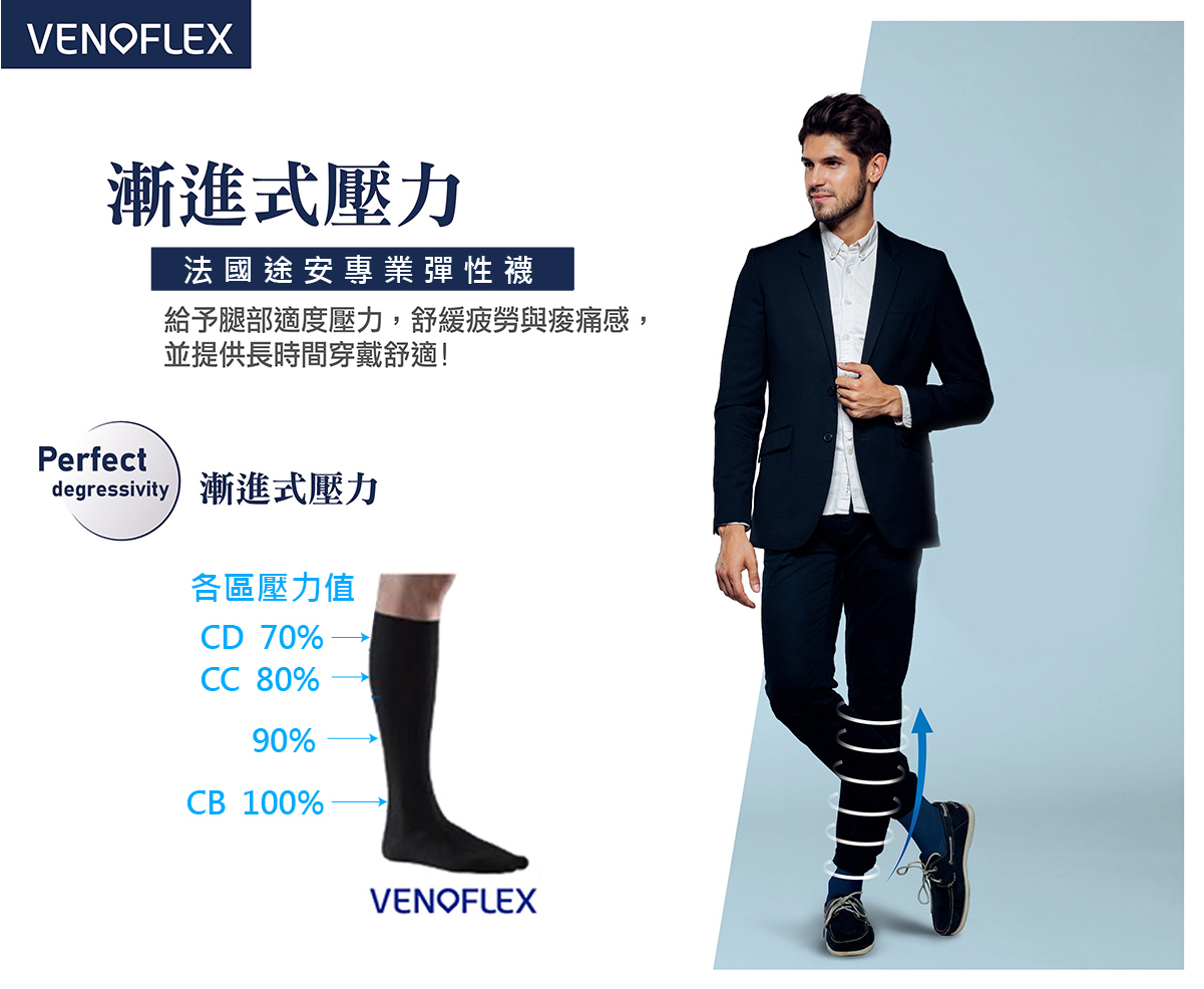 * 漸進式壓力分佈。具國際彈性襪 RAL壓力認證。